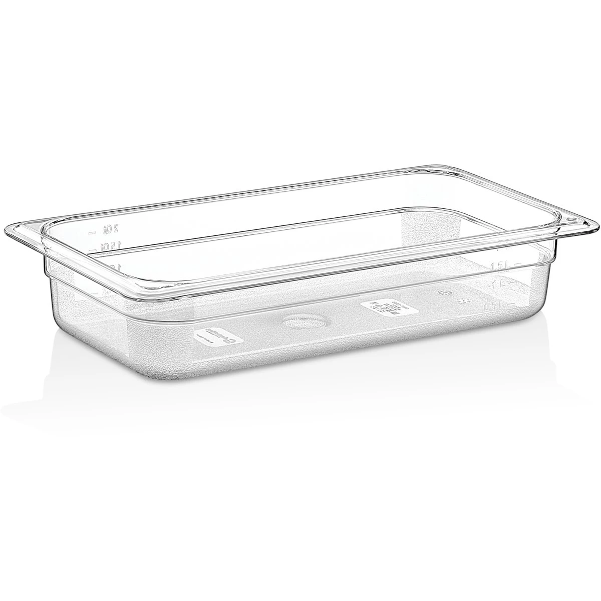 Add versatility to your kitchen with the help of this heavy duty gastronorm clear polycarbonate food pan. Made of durable polycarbonate, this pan can be added to your refrigerated prep tables or serve as a loose storage bin on your wire shelving. It’s a versatile addition to your kitchen because it can be used to prep, store, transport, and serve food items. You can even use it in your steam table or at your salad bar!