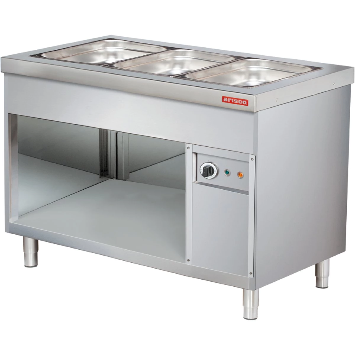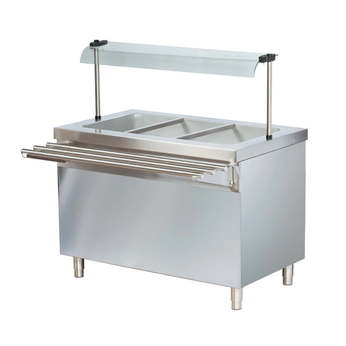 This unit is fantastic for a venue that wants to offer and display warm food in their catering venue. With a Bain Marie that can hold 3 x GN1/1 pans (not included) and an open cupboard located underneath, you will have plenty of storage and serving space. It’s operating temperature of +30°C to +90°C can set by it’s thermostat and be monitored during service thanks to it’s digital thermometer. Made in stainless steel, you can be sure this product will last a long time, and be easy to clean.