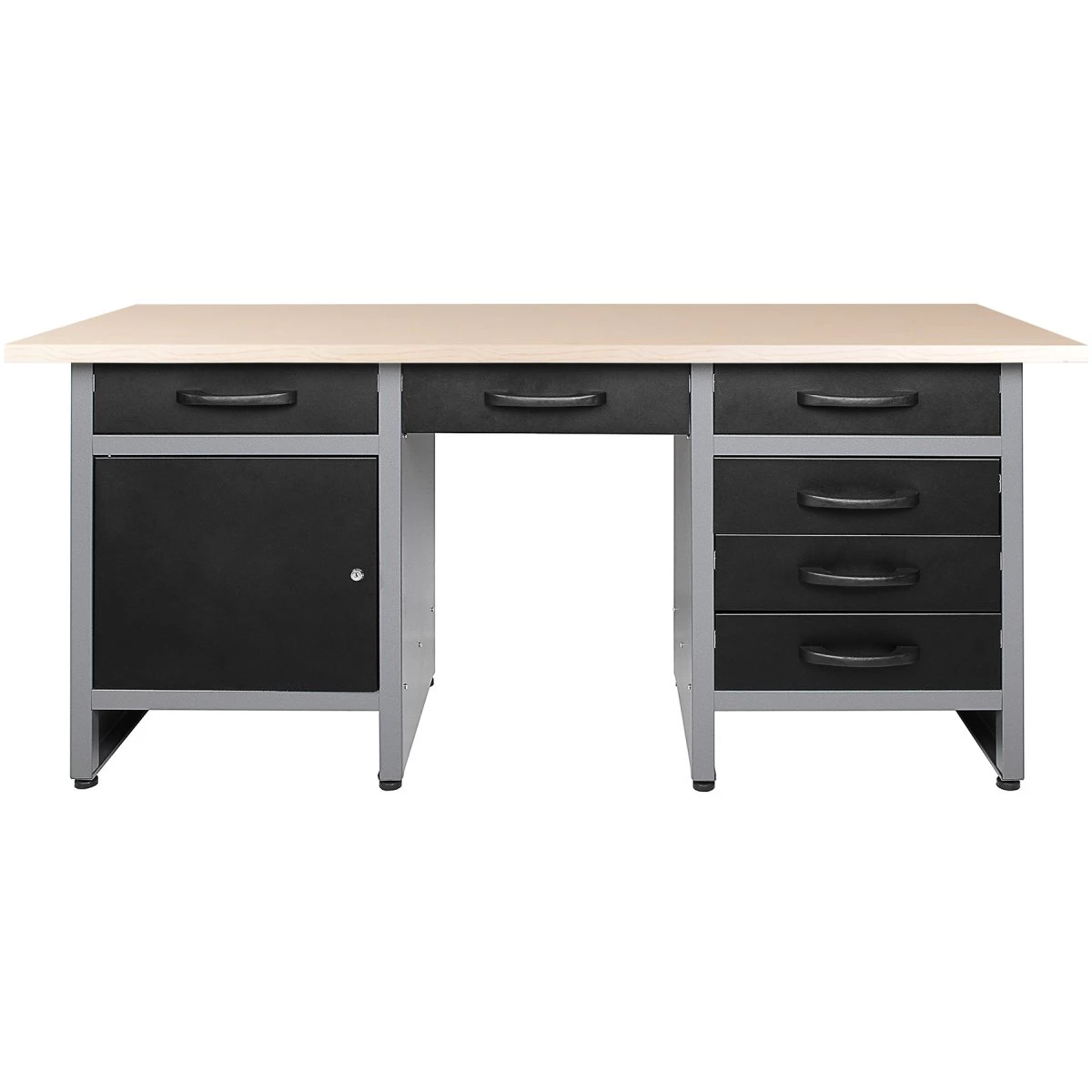 This heavy duty workbench has a sleek grey and black design, finished with a 30mm wooden desktop. Providing ample storage space, this workbench has 6 drawers and a lockable door.